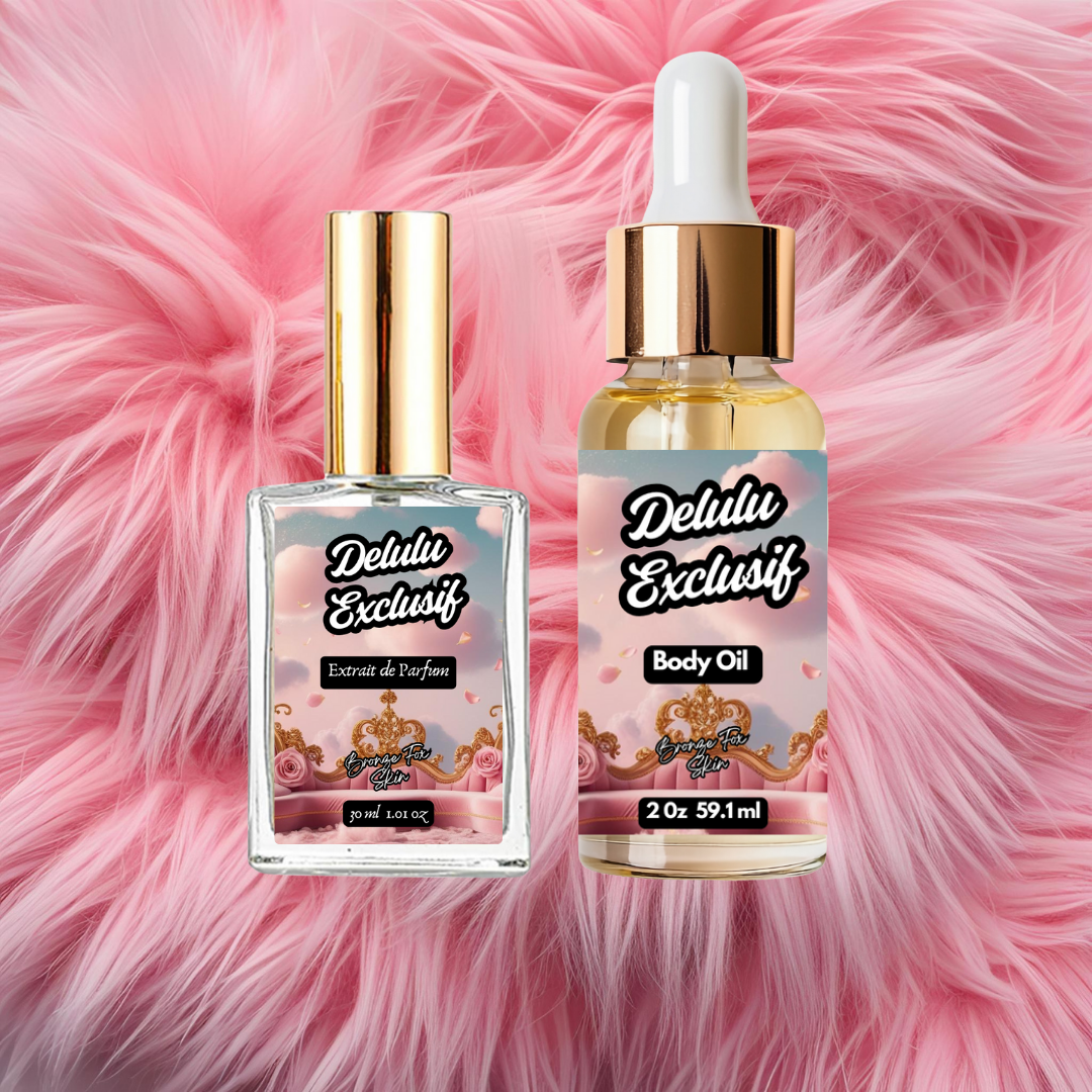 Flirty. Floral. Fantastical. Delulu Exclusif is a romantic fever dream bottled—where soft rose petals meet creamy sensuality and a dash of delusion. This ultra-lightweight body oil glides over skin like silk, leaving you glowing and wrapped in a rich, long-lasting scent that’s equal parts elegance and obsession.