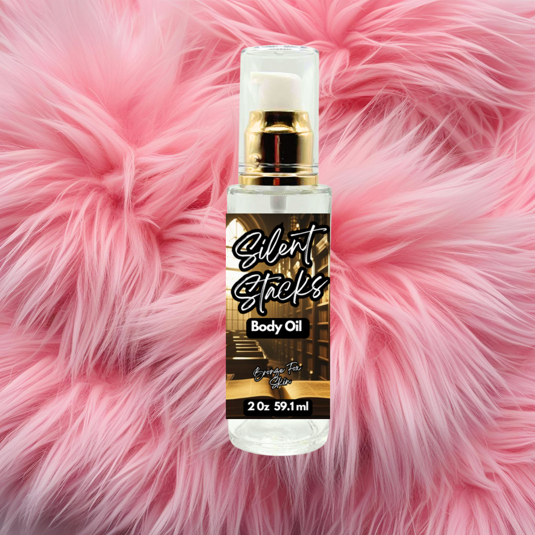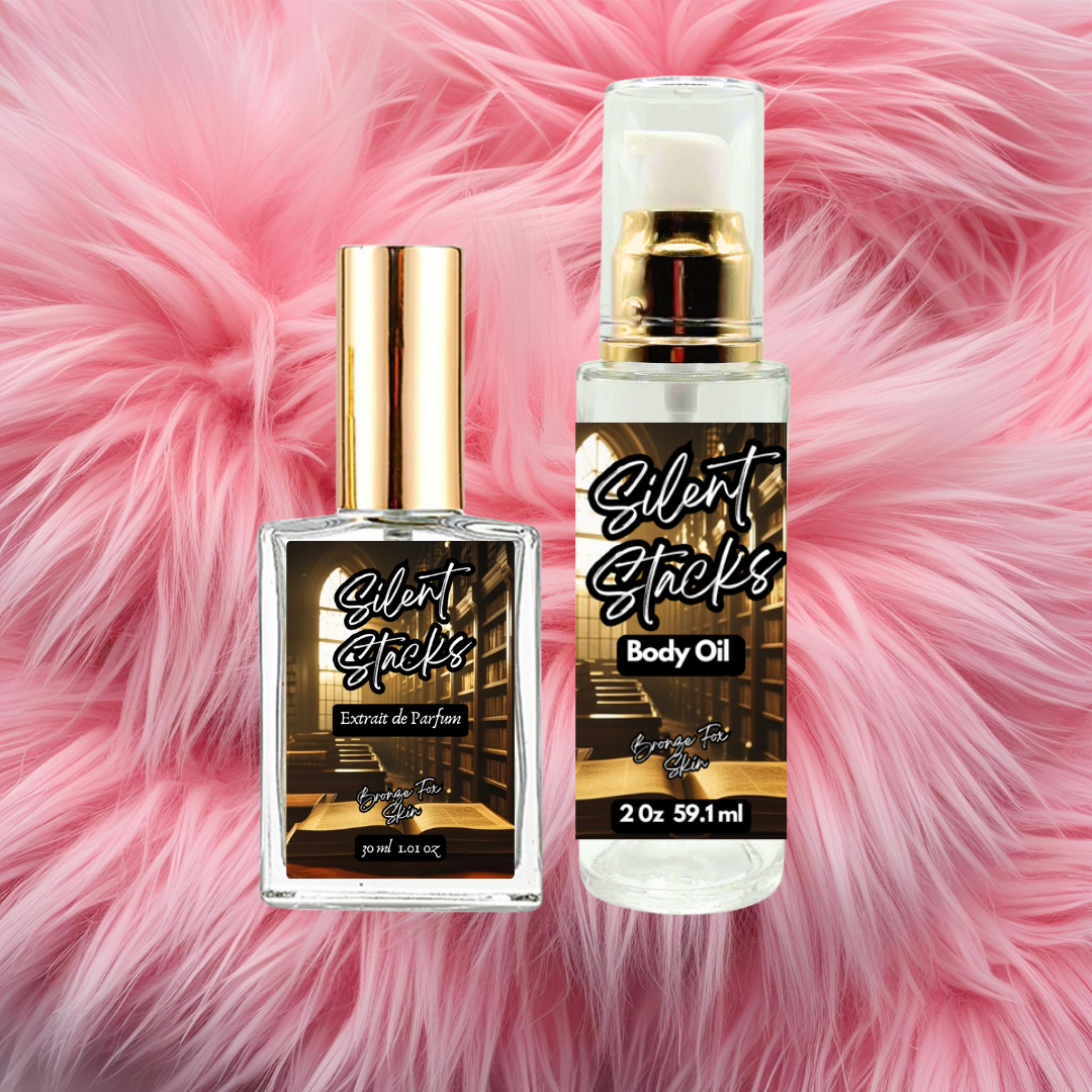 Silent Stacks conjures the hushed elegance of an antique library—warm spices, creamy resin, and elegant woods wrapped in plush vanilla. Available as a refined body oil, a concentrated extrait de parfum, a rich body butter, or a soft-focus dusting powder, this fragrance delivers inviting comfort with scholarly sophistication.